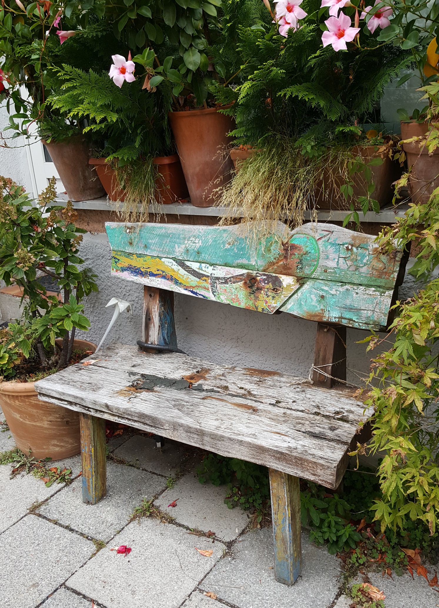 Auf dem Rückweg durch die kleinen Straßen zurück, komme ich an einem Lädchen vorbei, deren Fensterbänke voll sind mit Blumenkästen. Dazwischen steht eine kleine bunte Bank. Ein Rastplatz in all der Hektik der Großstadt.