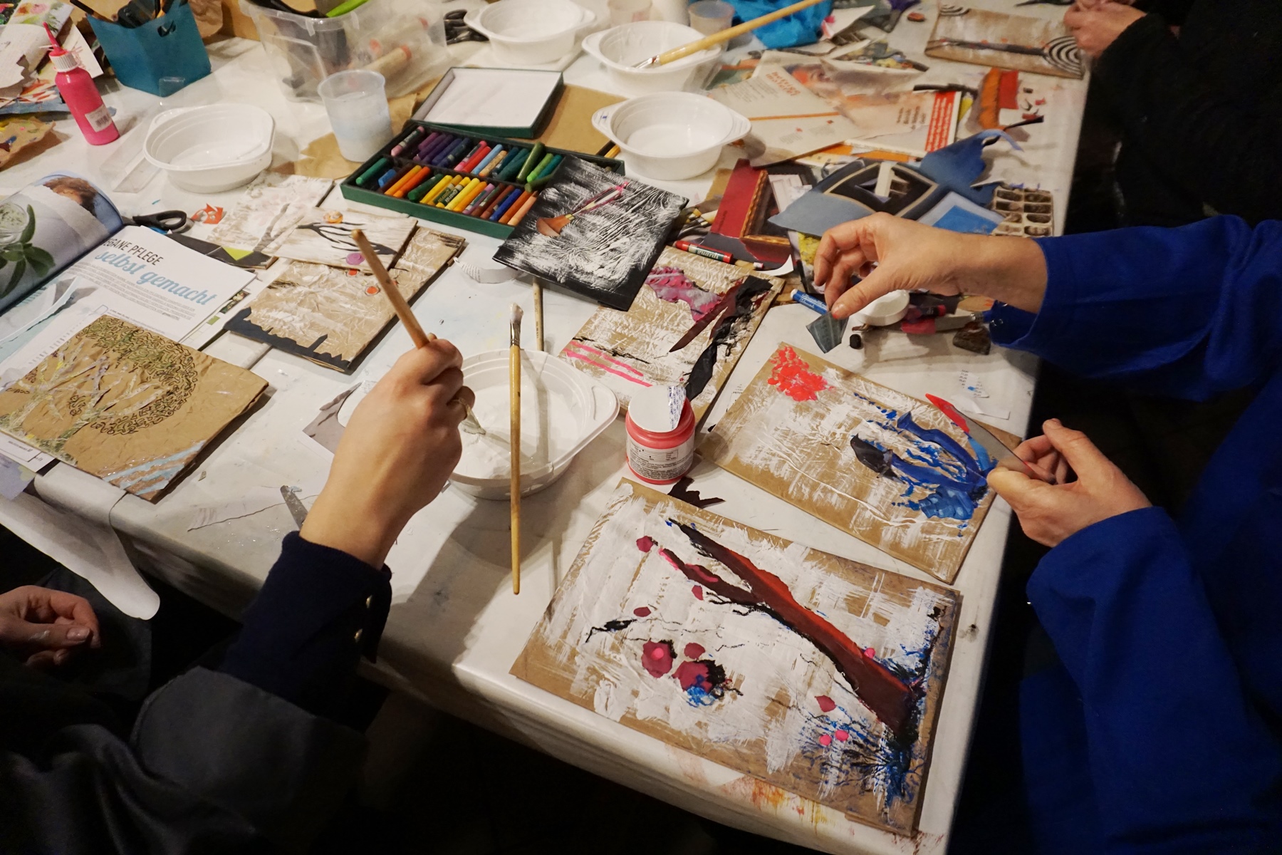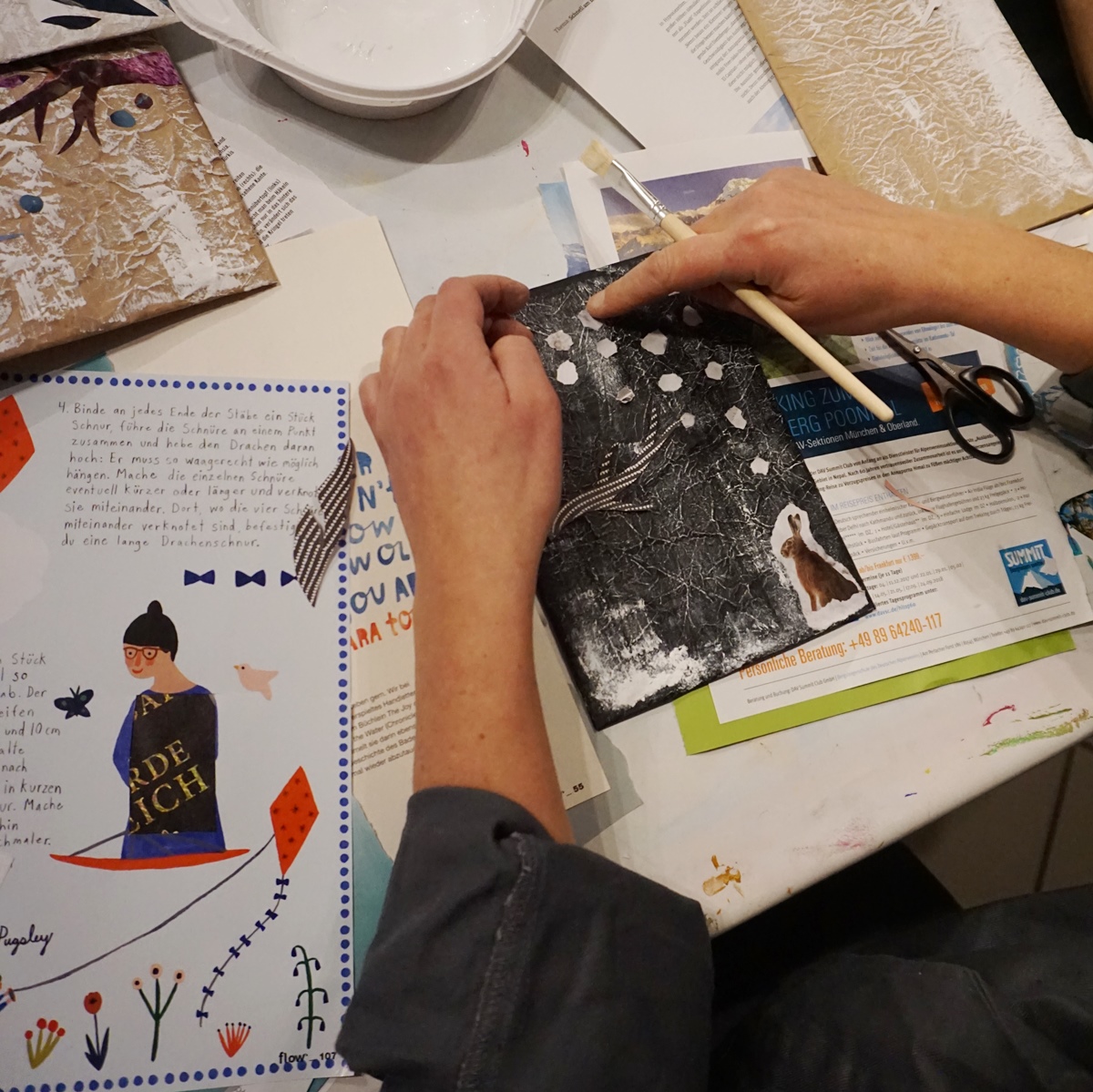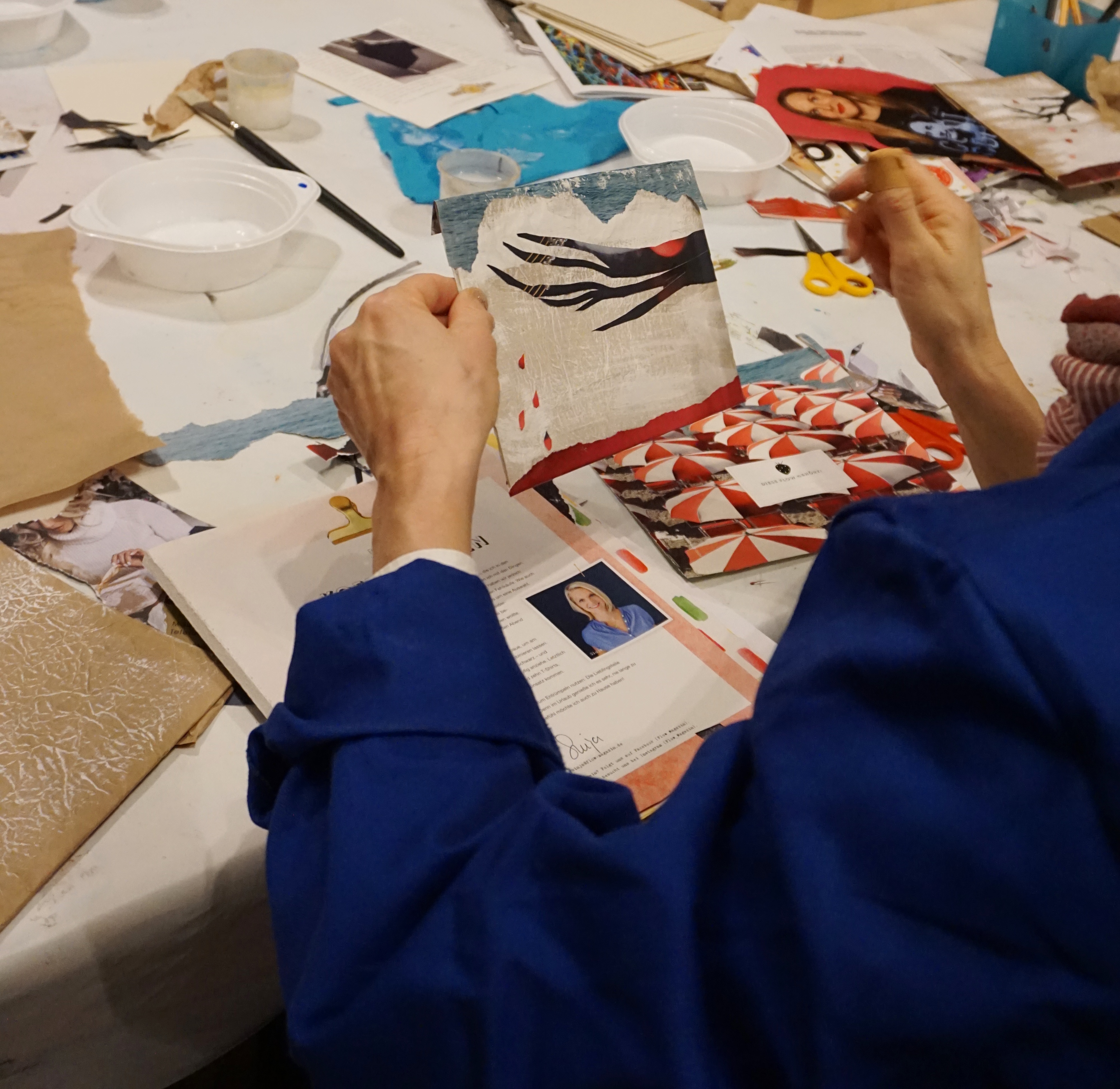 Ich erkläre noch kurz etwas zu Kontrast und Dimension, zu Farbgestaltung und Raumaufteilung und dann heißt es Farbe und Pinsel raus. Das geknautschte Papier überstreichen wir mit weißer Farbe und dann geht es auch schon los mit den alten Zeitschriften. Meine Workshopdamen verlieren sich für kurze Zeit in den Artikeln der Zeitschriften, es wird gequatscht und gelacht, doch plötzlich ist es ganz ruhig im Raum. Man hört nur noch das Rascheln der Zeitschriftenseiten, das Reißen der Blätter und den Schnitt der Scheren.