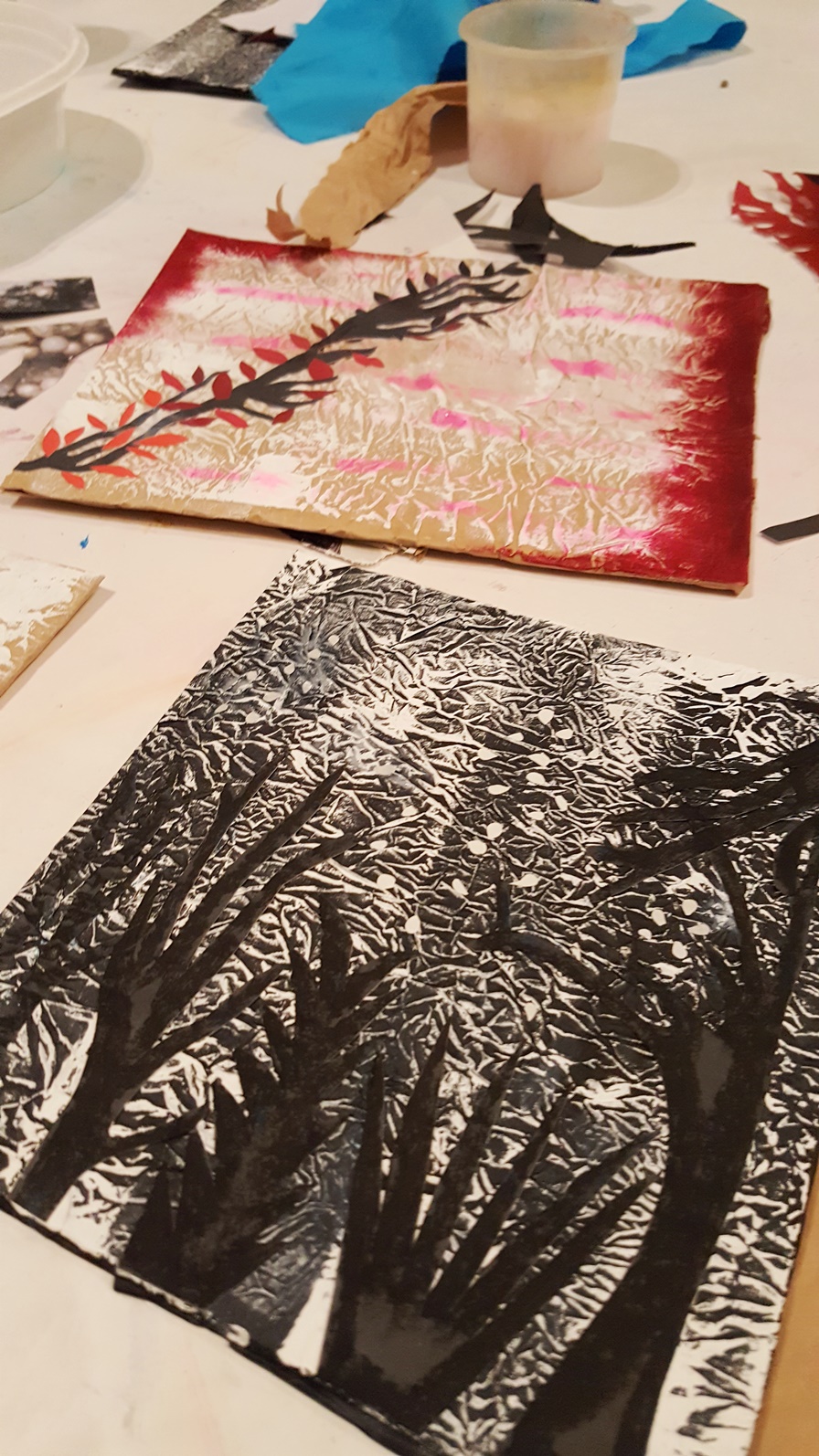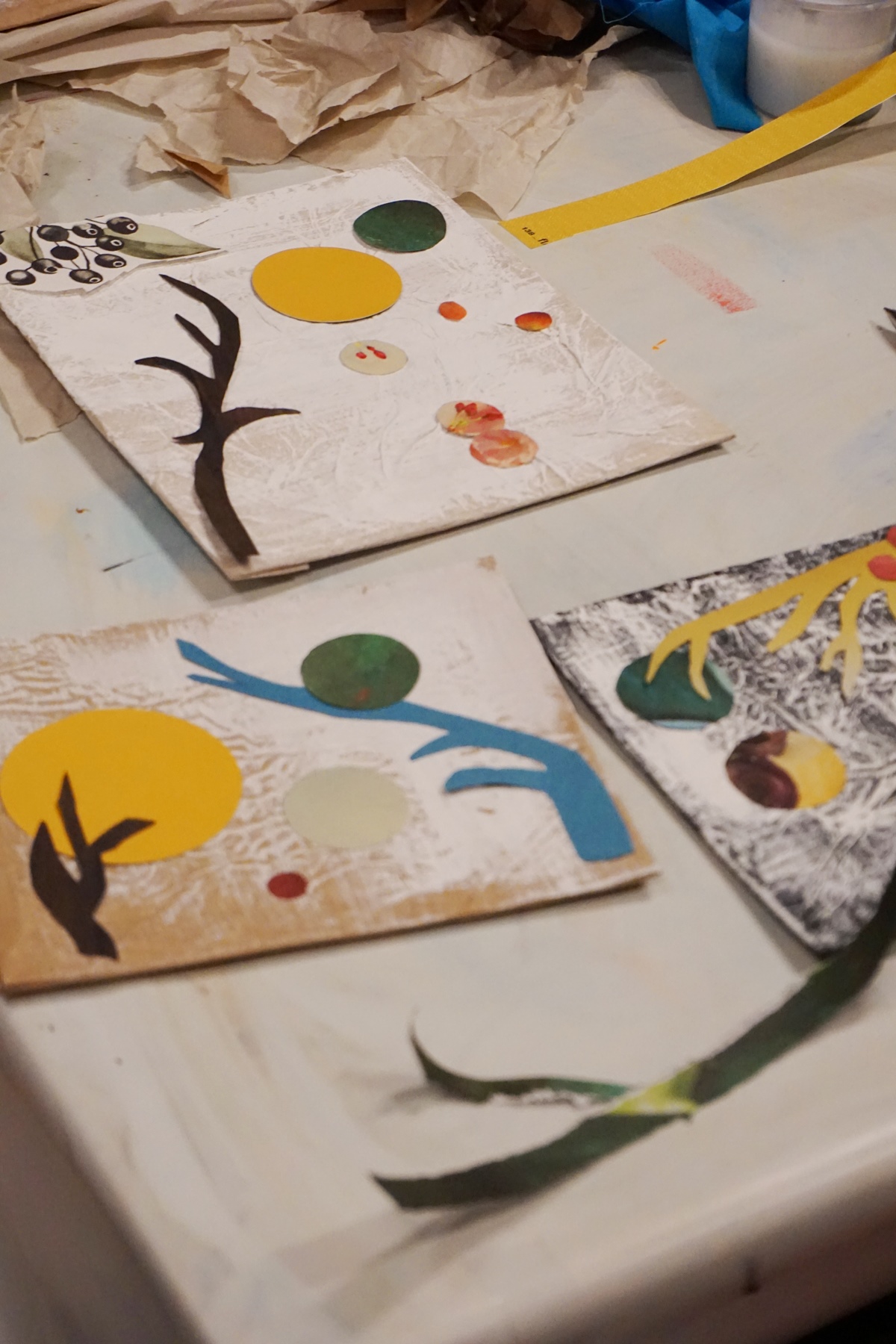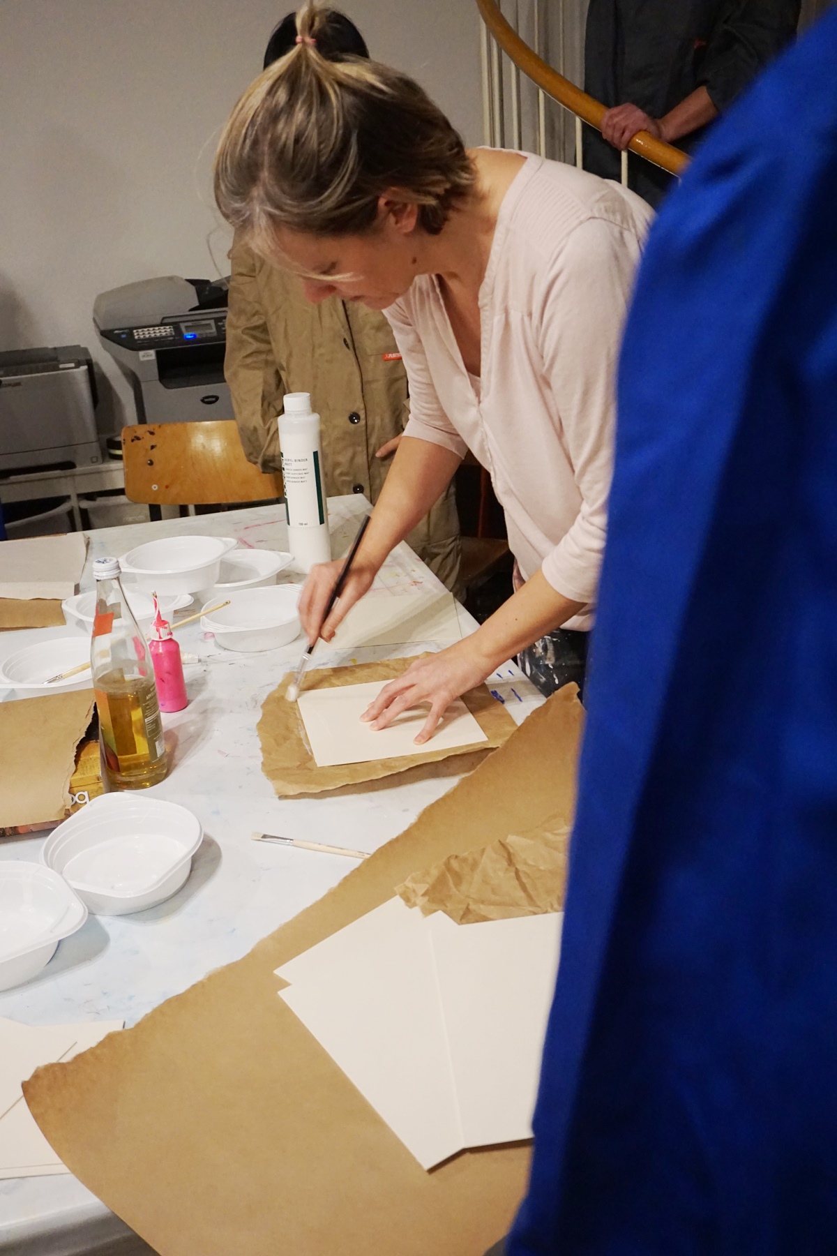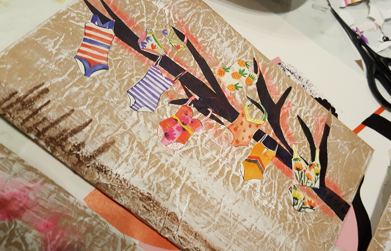 Ich erkläre noch kurz etwas zu Kontrast und Dimension, zu Farbgestaltung und Raumaufteilung und dann heißt es Farbe und Pinsel raus. Das geknautschte Papier überstreichen wir mit weißer Farbe und dann geht es auch schon los mit den alten Zeitschriften. Meine Workshopdamen verlieren sich für kurze Zeit in den Artikeln der Zeitschriften, es wird gequatscht und gelacht, doch plötzlich ist es ganz ruhig im Raum. Man hört nur noch das Rascheln der Zeitschriftenseiten, das Reißen der Blätter und den Schnitt der Scheren.